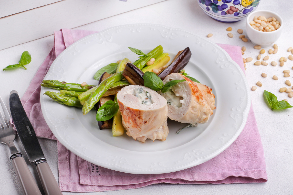 Ингредиенты простые и доступные: филе индейки, творожный сыр, кедровые орехи, базилик, кабачки, баклажаны и спаржа. Их сочетание создаёт баланс белка, жира и овощной свежести, не перегружая блюдо специями. Прекрасно подходит для быстрого семейного ужина, когда нужно вкусно и несложно.