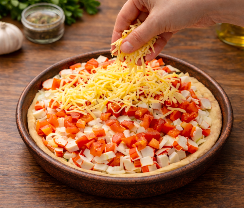 Основа из готового теста укладывается в форму, а внутри — кубики крабовых палочек, мелко порезанный лук и нарезанные помидоры. Небольшая порция майонеза добавляет кремовую нотку, а щепотка соли и перца завершает баланс. В финале — щедрый слой сыра, который запекается до золотистой корочки и удерживает начинку вместе, не позволяя ей расплываться. Результат — пирог с хрустящей корочкой и сочной, но не жидкой начинкой, который выглядит вроде бы неприметно, но впечатляет вкусом.