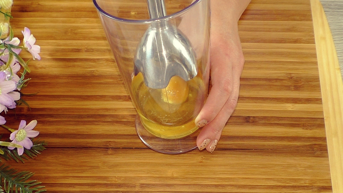 Начинается всё с эмульсии масла и первого яйца. В чашу блендера наливается растительное масло и добавляется яйцо. Блендер включается, и ингредиенты смешиваются до образования однородной массы, напоминающей майонез.