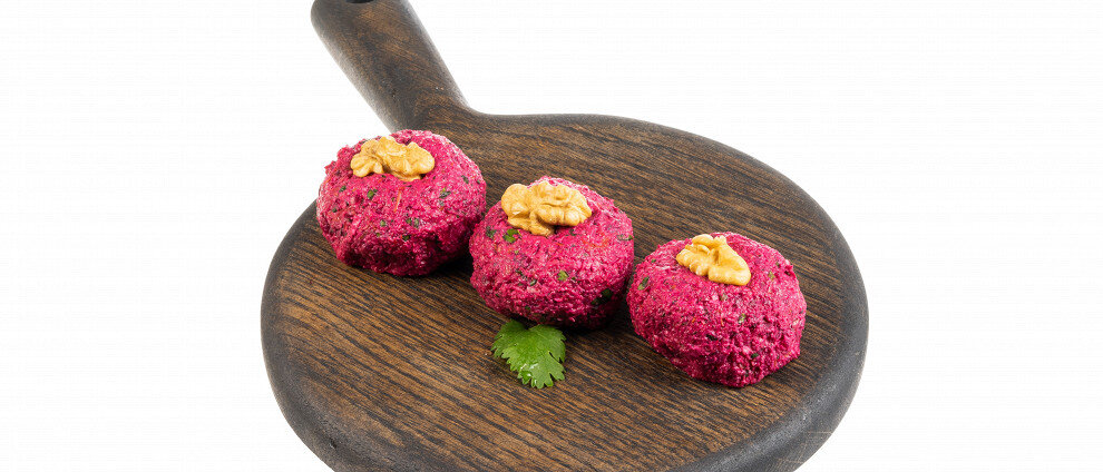 Свеклу можно отварить до готовности (время зависит от ее размера) или использовать уже готовую, купленную в магазине. Также отварить капусту в течение 40–60 минут.Пропустить овощи через мясорубку. Орехи измельчить с помощью блендера или натереть на терке, а кинзу мелко порубить.Смешать все ингредиенты, добавить специи, давленный чеснок, уксус и тщательно перемешать.Сформировать из массы шарики одинакового размера и подать, украсив орехами или зернами граната.Бургеры из моркови, семян и сала с свеклой