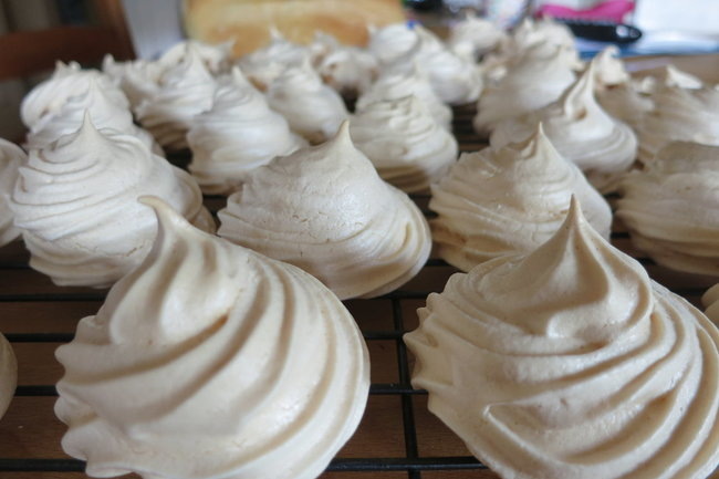 Разогрейте духовку до 90-100 °C. На противень, устланный пергаментом, выложите полученную массу с помощью кондитерского мешка или просто с помощью ложки. Сушите безе в духовке в течение 1,5–2 часов с приоткрытой дверцей. Готовые меренги легко отделяются от бумаги и сохраняют чистый белоснежный цвет.