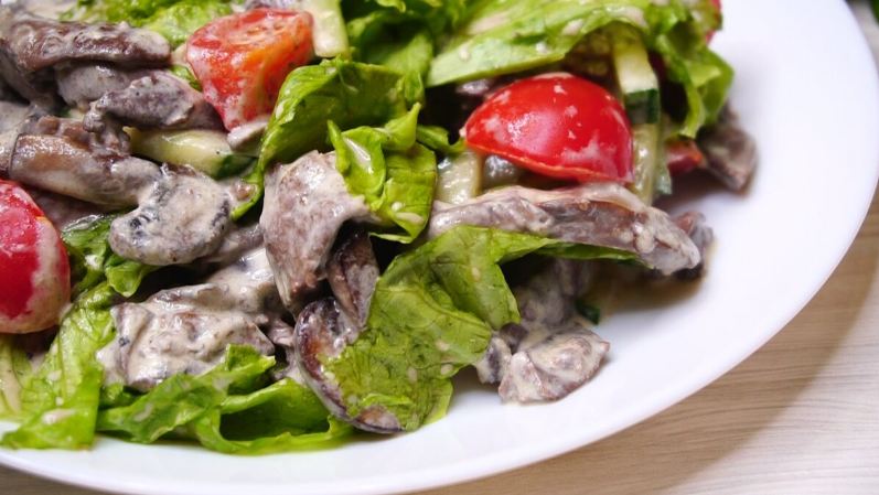 Куриная печень нарезается соломкой, а шампиньоны — ломтиками. Свежий огурец тоже следует нарезать соломкой, а помидоры — на дольки. Салатные листья промываются, обсушиваются и рвутся руками. Все это выкладывается на тарелку в перемешанном виде.