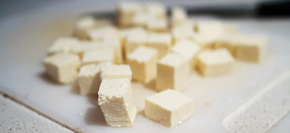 - Связать марлю с творогом и оставить под прессом: это обеспечит более плотную консистенцию, подходящую для нарезки кубиками.