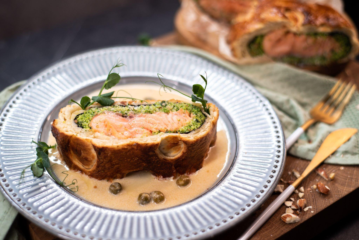 Это блюдо сочетает в себе утонченность и великолепный вкус. Velington с лососем, завернутый в аппетитное слоеное тесто, поражает своей изысканностью и подойдет для любого торжества.