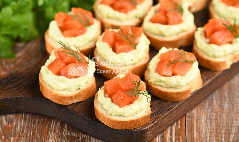 Теперь нарежьте багет на 20 ломтиков. На каждый кусочек охотно выложите получившуюся смесь и аккуратно сделайте углубление. Положите на них кубики или слайсы красной рыбы (150 г) и дополните укропом. Эти закуски не только выглядят эстетично, но и невероятно вкусны!