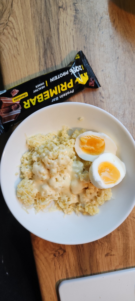 Утро начинается с сытной пшенной каши, приготовленной с сыром и яйцом, а для усиления зарядки подойдет протеиновый батончик.
