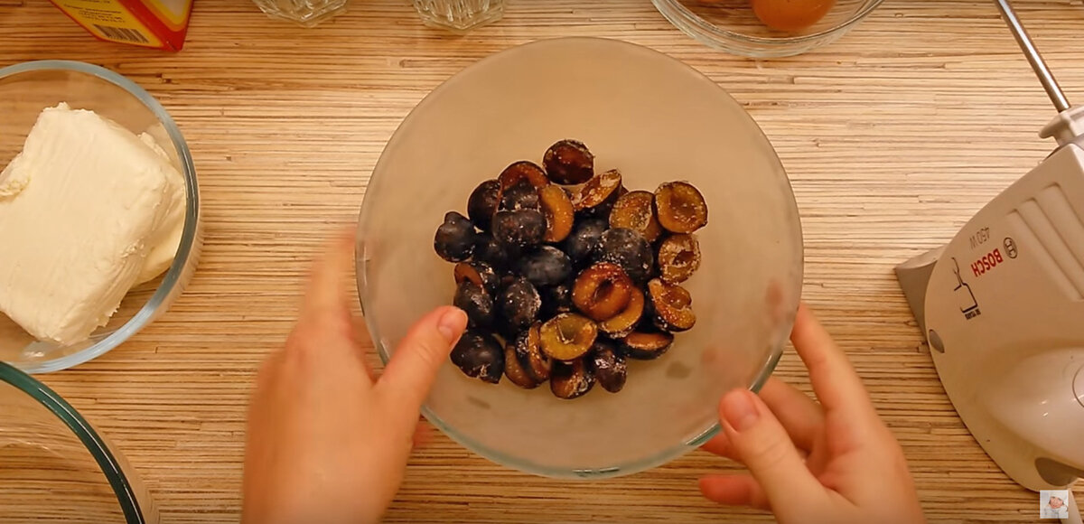 Выложите получившуюся массу в подготовленную форму, равномерно распределяя ложкой. Сверху красиво уложите половинки слив и отправьте в заранее разогретую духовку до 170 градусов на 30-40 минут. Проверяйте готовность пирога с помощью зубочистки — она должна выходить сухой.