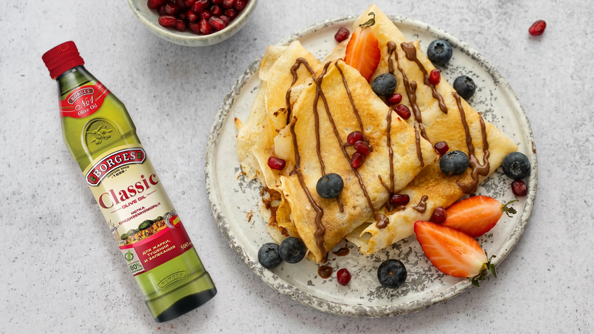 Оливковое масло Borges Classic — отличное решение для теста и жарки. Оно хорошо защищает текстуру блинов, не перебивая естественный вкус. Его полезные мононенасыщенные жиры делают блюда более сбалансированными.