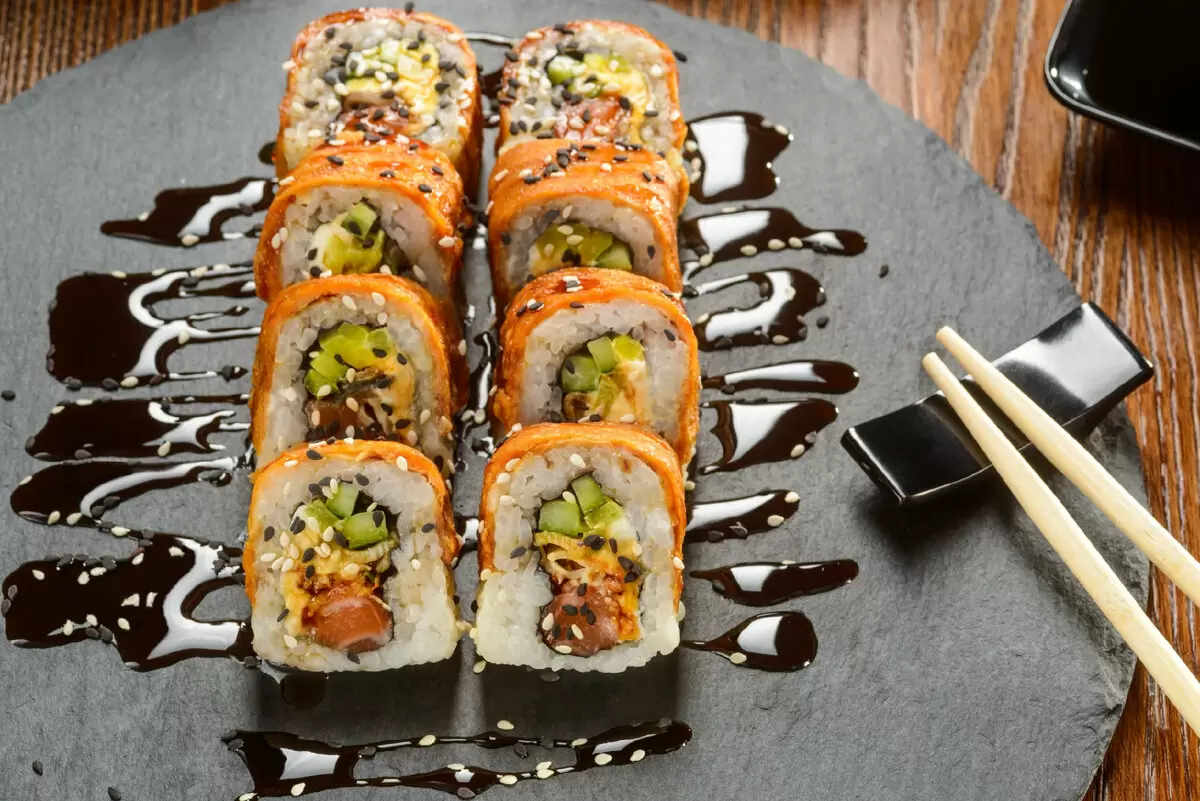 Последние штрихи: Острым ножом, смоченным в воде, разрежьте ролл на порции, обычно на 6-8 кусочков. Подавайте деликатес с соевым соусом и васаби, добавляя щепотку остроты.