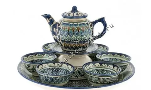 Каждое изделие риштанской посуды содержит в себе частичку души мастера. Следовательно, этот чайный сервиз — настоящее произведение искусства, способное стать семейной реликвией. Комплект включает большое блюдо для десертов, заварочный чайник с подставкой и шесть пиал для чая.