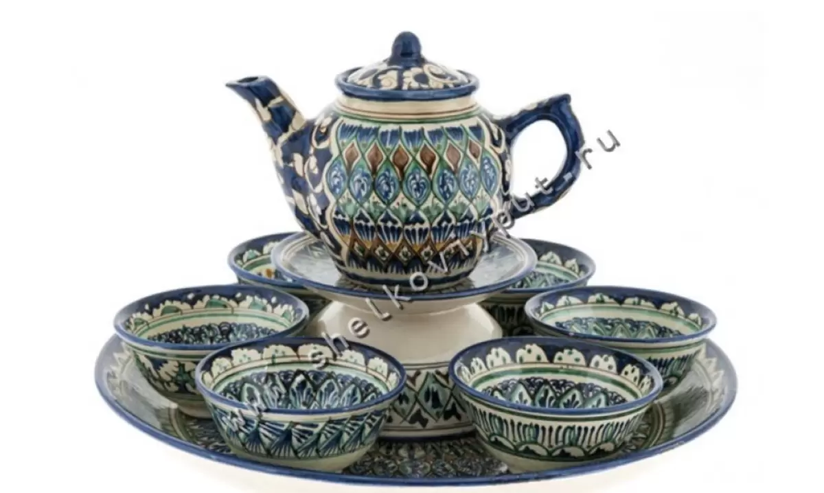 Керамическая посуда, выпущенная мастерами Риштана, станет настоящим украшением любого торжественного стола. Чайный сервиз, рассчитанный на шесть персон, выполнен и расписан вручную, сохраняя древние традиции. Он словно перенесён из сказок Шехерезады, внося в дом частичку волшебного восточного колорита.