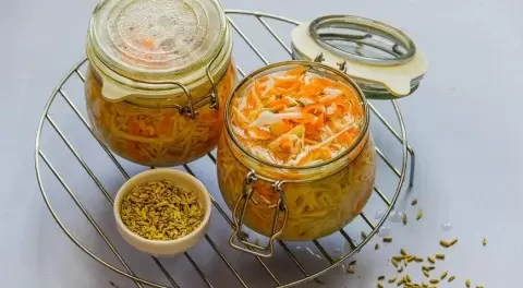 - Приготовление: горячий маринад из воды, масла и сахара заливается на капусту и морковь в банках. Уберите в холодильник на несколько часов.
