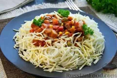 Для этого вдохновляющего рецепта понадобятся: спагетти, замороженные овощи, твердый сыр, томатная паста, базилик, сахар, чеснок, растительное масло, зелень и специи.