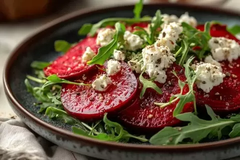 Этот салат становится настоящим кулинарным шедевром, объединяя три простых, но ярких ингредиента: сладкую запеченную свеклу, пряную руколу и нежный козий сыр. Его вкус приковывает внимание и идеально подходит как для повседневного ужина, так и для торжественного стола.