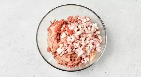 Для начала мясо следует нарезать небольшими кусочками и прокрутить через мясорубку или измельчить в блендере. Бекон, в свою очередь, нужно нарезать мелкими кубиками и добавить к основному фаршу. Следующий шаг: немного подсохший белый хлеб поломать на кусочки и измельчить в крошку — идеальным будет хлеб, который успел немного зачерстветь. Затем крошку необходимо размочить в воде и добавить к фаршу.