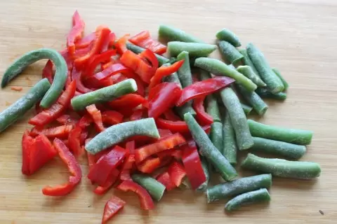 1. Начните с подготовки овощей. Стручковую фасоль можно использовать прямо из заморозки, а болгарский перец нужно очистить от семян и мелко нарезать.