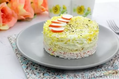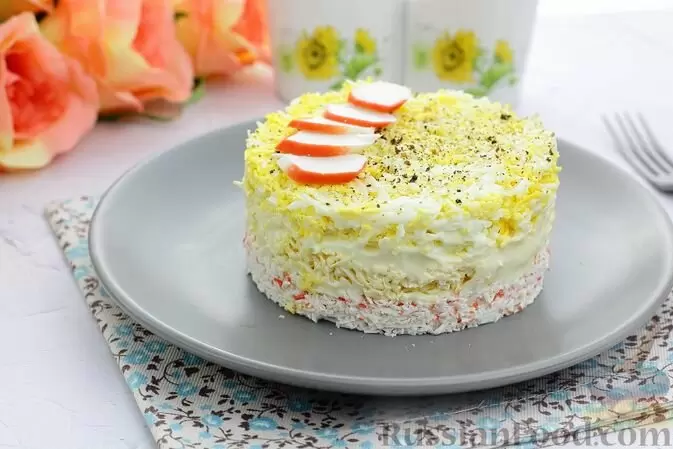 Для сладкого и сливочного завершения подойдёт слоёный салат с крабовыми палочками и плавленым сыром. Всего три главных ингредиента создают удивительный вкус!