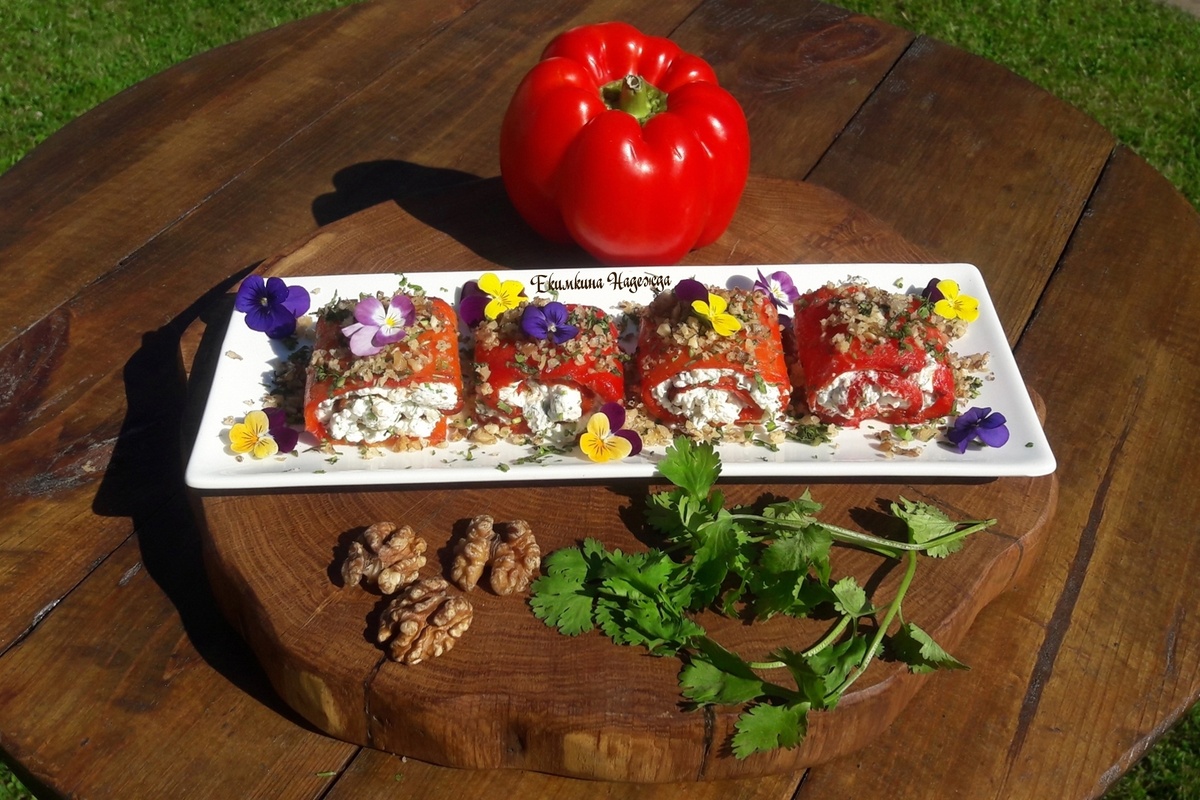 После этого перцы аккуратно заворачивают в рулетики. Для придания завершенного облика, блюдо сбрызгивают оливковым маслом, посыпают орехами и зеленью кинзы. Для эффектной подачи можно также украсить рулетики съедобными цветами.