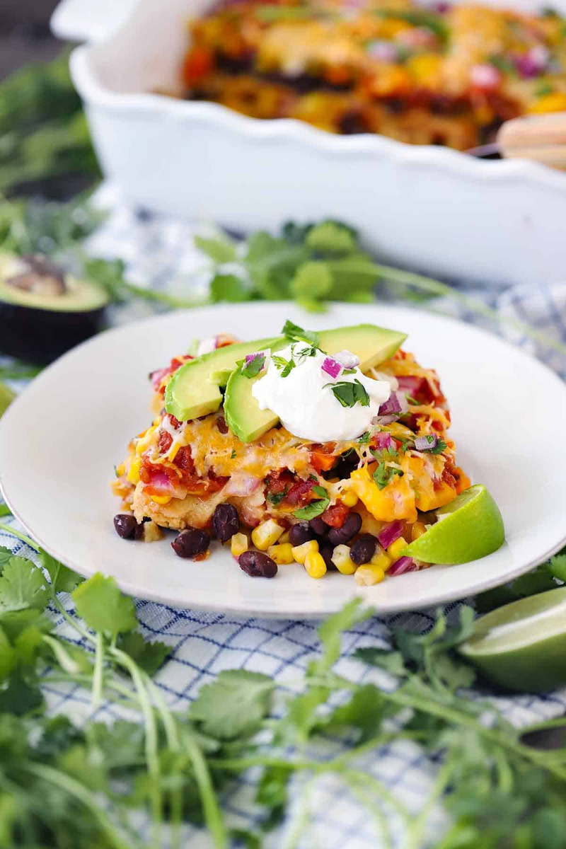 Запекайте лазанью под фольгой в течение 30 минут, затем снимите фольгу и продолжайте готовить еще 15 минут, пока сыр не станет золотистым и не начнет пузыриться. Подавайте горячей, украсив по желанию свежей кинзой, авокадо и дольками лайма, чтобы насладиться полноценным мексиканским вкусом!