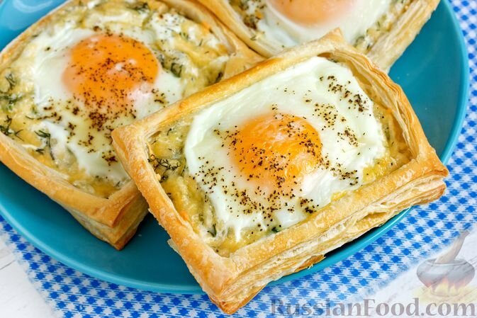 Еще одна оригинальная идея — яичница с сыром и зеленью в "чашечках" из слоёного теста. Это не только интересно, но и очень вкусно!