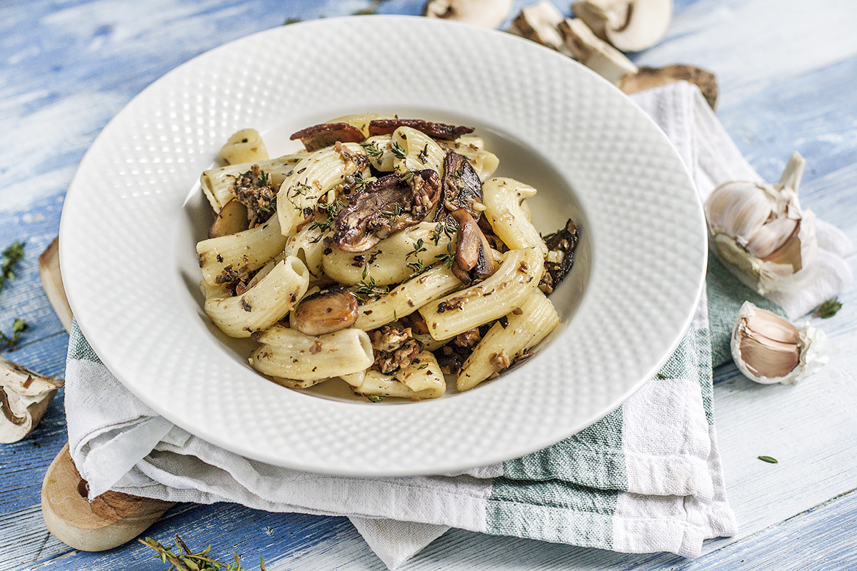 Шаг 1: Вскипятите 1,5 литра воды и залейте сушёные белые грибы 100 мл горячей воды. Оставшуюся воду налейте в кастрюлю и доведите до кипения. В кипящую воду добавьте ригатони, посолите и варите на сильном огне 3 минуты. Обязательно сохраните половник воды из-под пасты, а затем откиньте готовое тесто на дуршлаг.