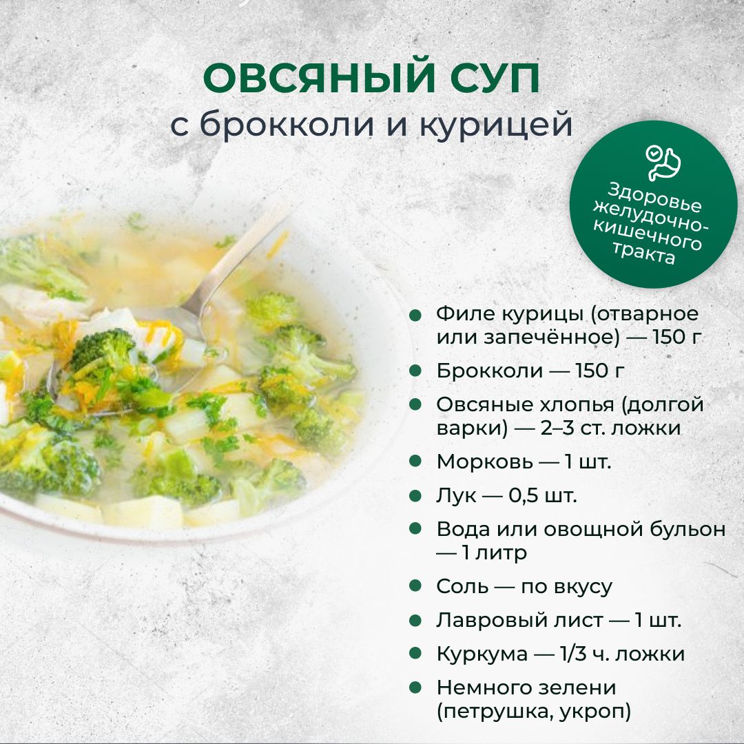 Этот суп обладает прекрасным согревающим эффектом, что делает его идеальным для тех, кто страдает от проблем с желудком или испытывает упадок сил. Брокколи и овсянка обеспечивают организм клетчаткой и необходимыми витаминами, а куриное филе является отличным источником легкого белка. Дополнительная порция куркумы оказывает противовоспалительное действие и поддерживает функционирование печени.