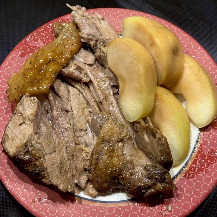 Разрезав готовое блюдо, его можно подавать с гарниром, например, моченым яблоком, что создаст уникальное сочетание вкусов. Для улучшения рецепта в будущем стоит добавить немного клюквы и ложку меда в маринад – это придаст блюду нужную кисло-сладкую ноту!