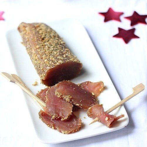 Специи. Втереть смесь специй в поверхность мяса, слегка надавливая. Затем завернуть филе в чистую ткань и разместить в наименее влажной части холодильника, например, в ящике для овощей. Оставить на 2 недели для окончательной вяленьи.