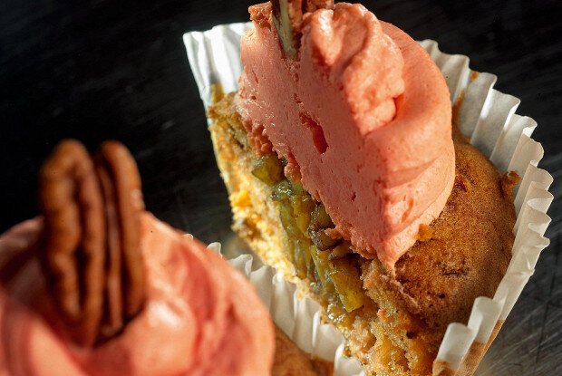 Начать с того, что свежевыжатый морковный сок следует уварить до уменьшения объема в три раза. После остывания объединить его с растительными сливками, творогом и сахарной пудрой. Поставить получившийся крем в холодильник на полчаса.Приготовить тесто: яйца взбить с 120 г сахара до пышной массы, затем добавить тертую морковь, муку, растительное масло, грецкие орехи, 35 г изюма, сахарный сироп, разрыхлитель, соду, соль, 1 г корицы и ванильную эссенцию. Все хорошо перемешать на низкой скорости в блендере.Разогреть духовой шкаф до 180 градусов и выложить тесто в формы для кексов. Выпекать 15-18 минут. Оставить остужаться.Тем временем нарезать яблоко на мелкие кубики и обжарить его на сливочном масле с остатками изюма, сахара и корицы. Измельчить 7 орехов пекан и добавить в смесь, готовить на медленном огне 15-20 минут. Оставить остывать.Когда капкейки остыли, вырезать конусообразные углубления в каждой выпечке и нафаршировать их яблочной начинкой.Завершить творение, украсив капкейки морковным кремом и орехами пекан.С каждым укусом наслаждайтесь гармонией вкусов и текстур, которую создают эти великолепные капкейки. Приятного аппетита!