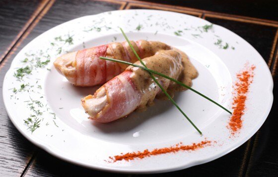 Сначала свиное филе следует очистить от пленок и нарезать поперек волокон. Каждый кусочек плотно отбить, посолить, затем положить на него 2–3 кусочка шпика, обильно присыпанного растертым тмином. Завернуть каждый ломтик в рулет и связать ниткой.На сковороде обжарить нарезанные кольца лука до золотистого цвета, затем добавить подготовленные зразы, обжаривать с двух сторон. После этого добавить немного воды, накрыть крышкой и тушить до полной готовности. В конце готовки влить в сковороду сметану, смешанную с пассерованной мукой, приправить солью по вкусу и довести до кипения.Подача