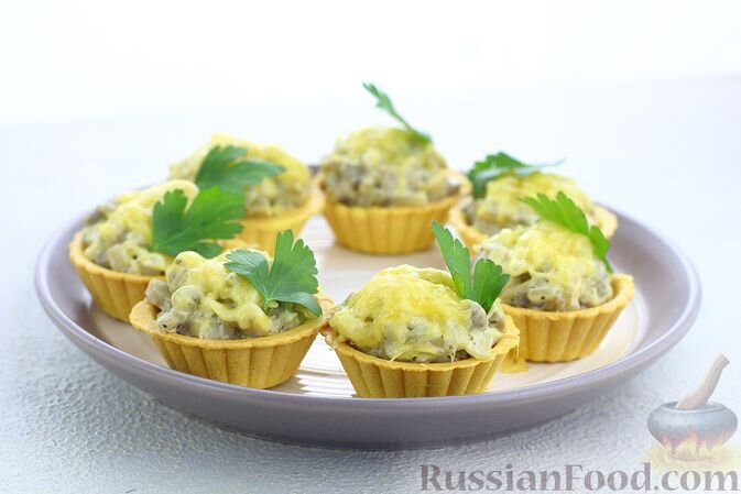 Начнем с тарталеток с грибами и сыром. Это простое в приготовлении блюдо станет отличной горячей закуской. Начинка готовится из жареных шампиньонов и лука, смешанных со сметаной. Всего несколько минут в духовке, чтобы расплавился тертый сыр, и аппетитные тарталетки готовы!