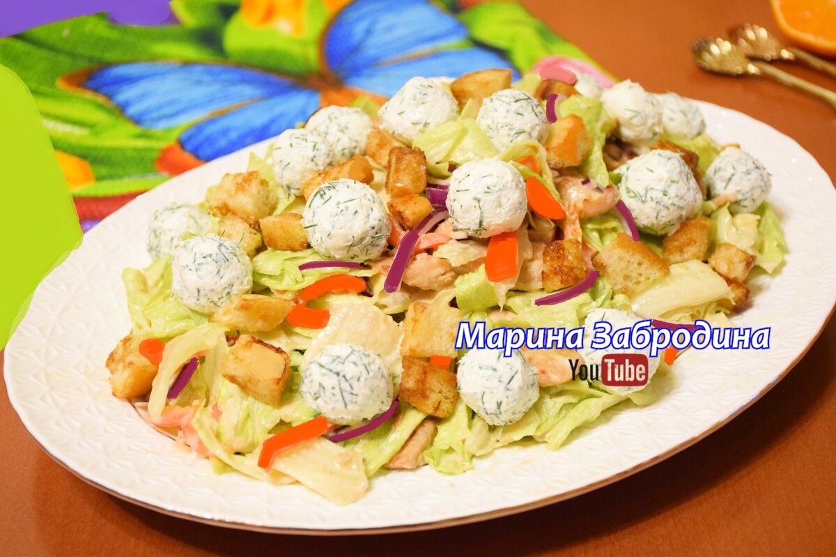 Подавайте на стол, посыпав крутонами и украсив сырными шариками и мандариновыми дольками. Подарите своим близким незабываемый вкус домашнего праздника!