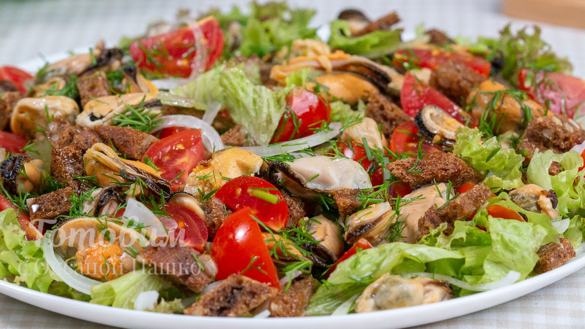 4. На плоскую тарелку положите нарезанные листья салата, затем добавьте помидоры, лук, мидии и гренки. Сверху посыпьте укропом.