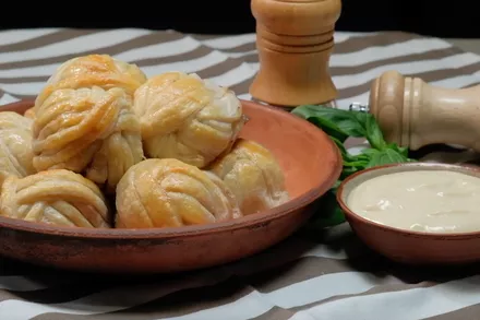 Смешать фарш с мелко нарезанным луком и специями: добавьте кориандр и сушеный чеснок.Легко раскатать слоеное тесто и нарезать его тонкими длинными полосками.Из подготовленного фарша сформировать небольшие шарики и обмотать их тестом, создавая своеобразные "клубки".Выложить получившиеся «клубочки» на противень, застеленный пергаментом, смазать яйцом и запечь в духовке, разогретой до 180°C, на протяжении 30 минут.Приготовить чесночный соус: смешать оливковое масло, молоко, чеснок, лимонный сок и горчицу в блендере, доведя до однородной консистенции.Закуска готова! "Клубочки" получаются хрустящими и золотистыми снаружи, а внутри остаются сочными и невероятно вкусными.