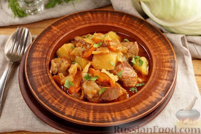 1. Жаркое из свинины с картошкой и капустой. Это ароматное блюдо готовится с доскональностью: свинину и овощи сначала обжаривают отдельно, что придаёт мясу невероятную нежность, а овощам – сочность.