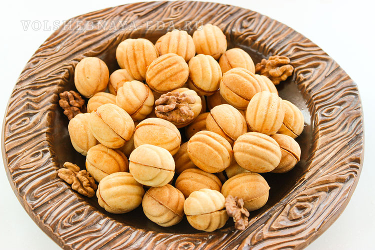 Заполните «скорлупки» вареной сгущенкой и вставьте по кусочку грецкого ореха. Сформируйте печенье, соединяя половинки. Получается потрясающее рассыпчатое лакомство, которое лучше хранить в герметичном контейнере в прохладном месте.
