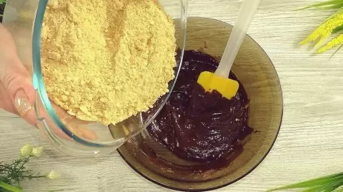Когда шоколад полностью растопится, добавьте его в смесь с маслом и сгущёнкой, снова перемешивая до получения гладкой консистенции. Затем постепенно добавьте крошку печенья, аккуратно вмешивая её в шоколадную массу. Если тесто выглядит слишком сухим, можно добавить одну или две столовые ложки молока — оно должно получиться по консистенции похожим на мокрый песок.