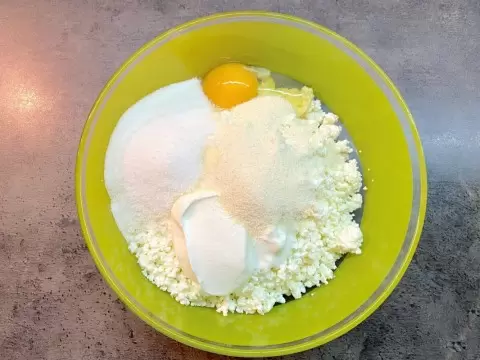 Для начала, готовится начинка. В глубокой миске смешиваются творог с добавлением сметаны, манной крупы, сахара, яйца, ванилина и немного соли. Нежелательно взбивать массу, просто тщательно размешать до однородной консистенции. Если творог слишком жидкий, его стоит отцеживать на сите.