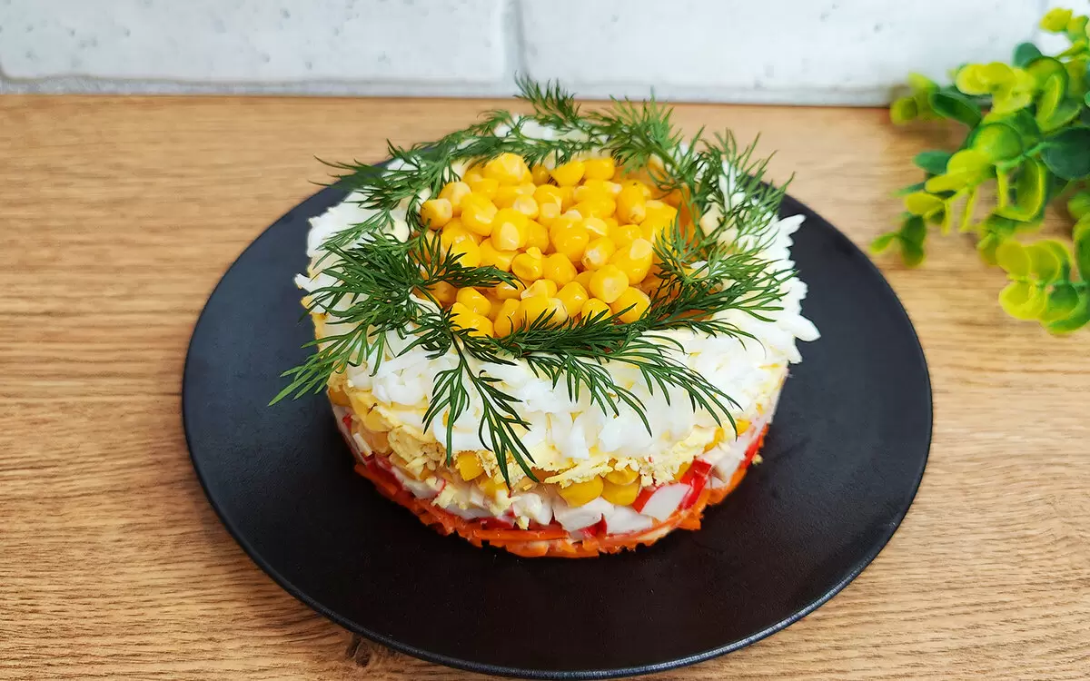 Шаг 4: Распределите слой кукурузы — она добавит яркости и сладости, и немного помажьте майонезом.