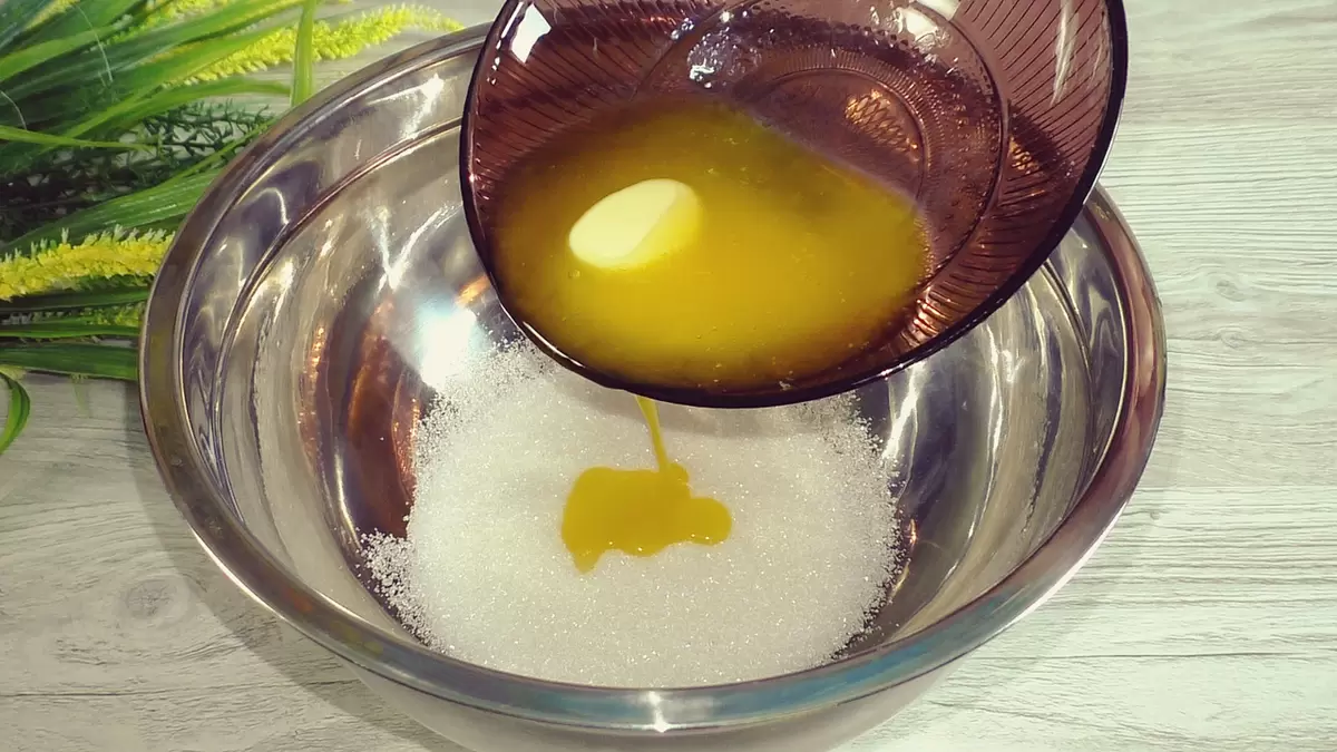 Для начала, в глубокой миске нужно смешать сахар с растопленным сливочным маслом, добившись однородной консистенции. Затем следует добавить три яйца и тщательно перемешать.