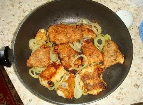 Очистить картофель и положить в кастрюлю с одной очищенной головкой лука. Залить водой и варить до готовности.Нарезать филе хека на небольшие кусочки, приправить солью и перцем, обвалять в муке. Яйцо взбить с небольшой щепоткой соли в отдельной миске. Разогреть растительное масло в сковороде.Обмакнуть кусочки рыбы в взбитое яйцо и уложить на сковороду. Обжаривать с обеих сторон по 10-15 минут до золотистой корочки.На готовую рыбу выложить кольца репчатого лука. Убавить огонь и оставить томиться на 10 минут.Когда картошка сварится, слить воду, удалить лук и разомнуть в пюре. Добавить молоко и немного варочной воды по вкусу, посолить.Выложить на тарелку картофельное пюре, сверху разместить рыбу с луком. Блюдо готово к подаче!Приятного аппетита! Это блюдо станет настоящим украшением любого стола. Поделитесь своими впечатлениями о рецепте в комментариях!