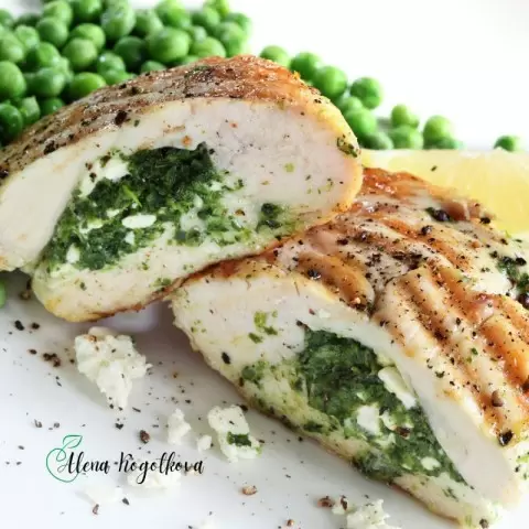 3. Для начинки на сковороде слегка припустите шпинат. Затем добавьте творог и тщательно перемешайте. Наполните кармашки куриного филе полученной начинкой, при желании закрепите края зубочисткой.
