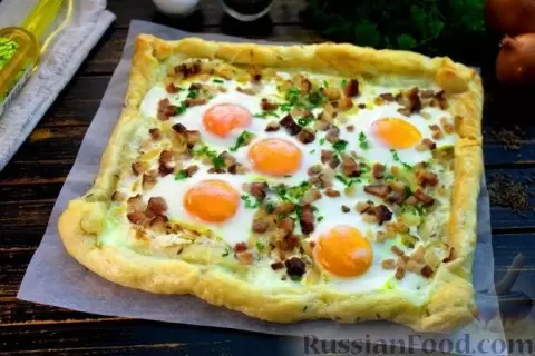 - Слоёный тарт с яичницей и беконом: Это аппетитное угощение можно быстро приготовить из готового слоёного теста. Начинка из солнечного обжаренного лука, сметаны и яиц с беконом подарит настоящий гастрономический праздник, сочетая в себе вкус пиццы и хачапури.