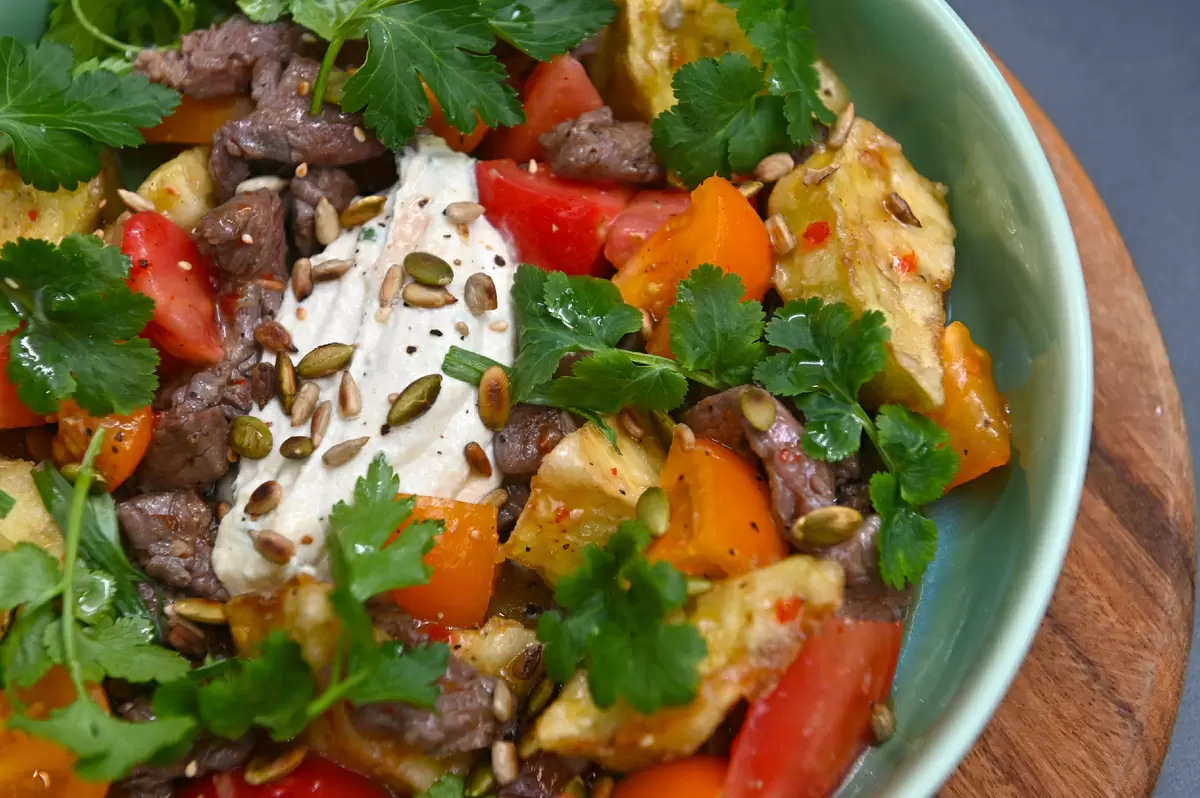Вас ждет яркое кулинарное открытие под руководством шеф-повара Ильи Куваева из программы «Ешь и худей». Этот теплый салат становится настоящим фаворитом на столе благодаря сочной говядине, хрустящим баклажанам и нежному крему из кешью.