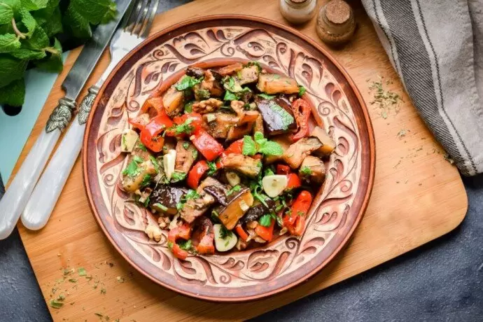 Не забудьте про грецкие орехи! Их необходимо мелко нарезать и добавить в сковороду к овощам. Хорошо перемешайте все ингредиенты и прогрейте их на огне еще несколько минут. После этого переложите готовые баклажаны в тарелки и подавайте к столу.