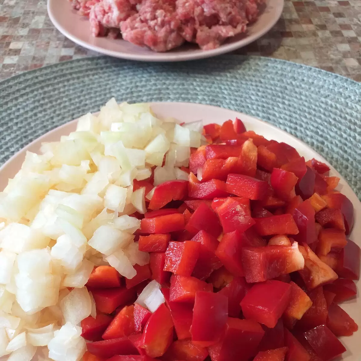 Первым шагом станет нарезка сладкого перца и репчатого лука кубиками. В сковороду с разогретым растительным маслом отправляются овощи, которые обжариваются до мягкости. Как только лук становится прозрачным, нужно добавить фарш, соль, перец и специи, и готовить до полной готовности фарша – около 10-12 минут.