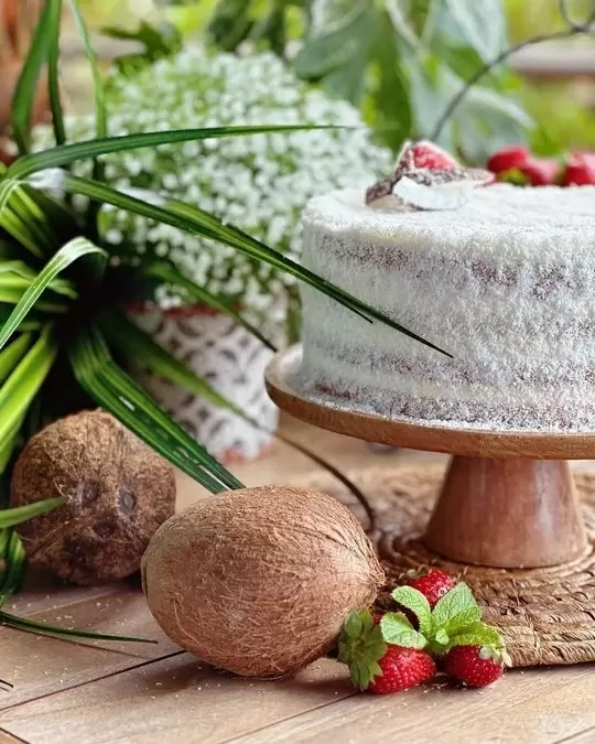 Для двух сквозных бисквитов смесь включает яйца, сахар, кокосовое масло, ваниль, кокосовую муку, обычную муку и разрыхлитель. Все компоненты тщательно соединяют и выпекают по привычному режиму, чтобы получить лёгкий и влажный внутренний слой десерта.