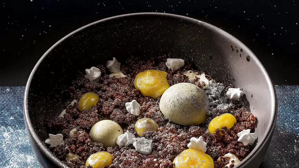 Завершает сет необычный десерт, воссоздающий момент высадки на Луну. Поверхность создана из крошки песочного печенья с добавлением какао, а перламутровые купола йогуртового мусса и белого шоколада символизируют следы первых шагов человека на Луне. Капли лимонного курда и мини-меренги формируют кратеры и геологические образования, а серебряная пудра добавляет атмосферу космической пыли.