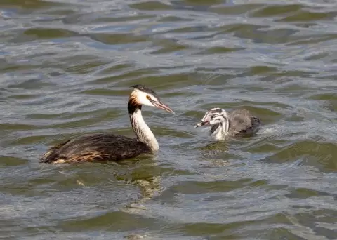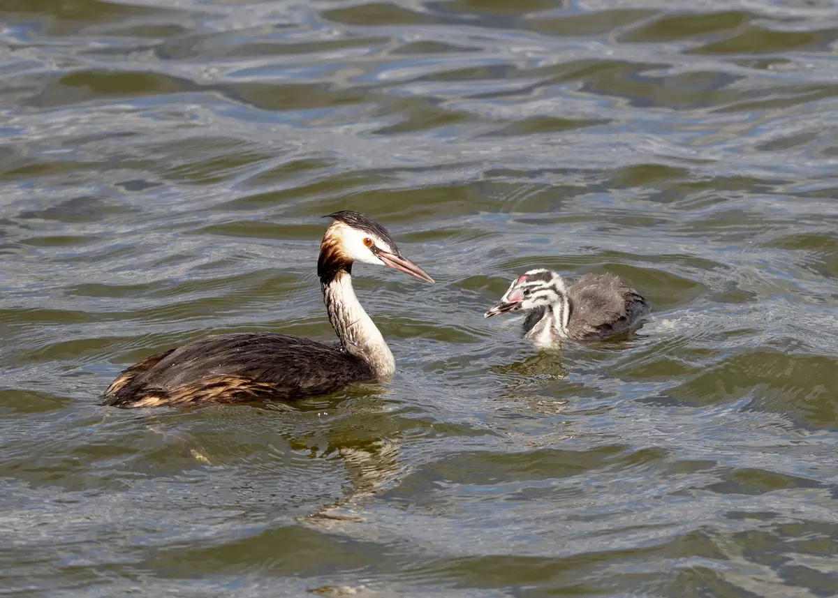 На протяжении дня многие могли стать свидетелями того, как заботливые родители чомги кормили своих малышей. Самец и самка Больших поганок выглядели практически одинаково, что усложняло задачу идентификации. На одном из снимков запечатлена, судя по всему, мама-Чомга, которая, плывя вдоль берега, выискивала вкусную рыбку для своего птенца. Для малыша это было волнительное время, он требовательно пищал, напоминая родительнице о своих нуждах