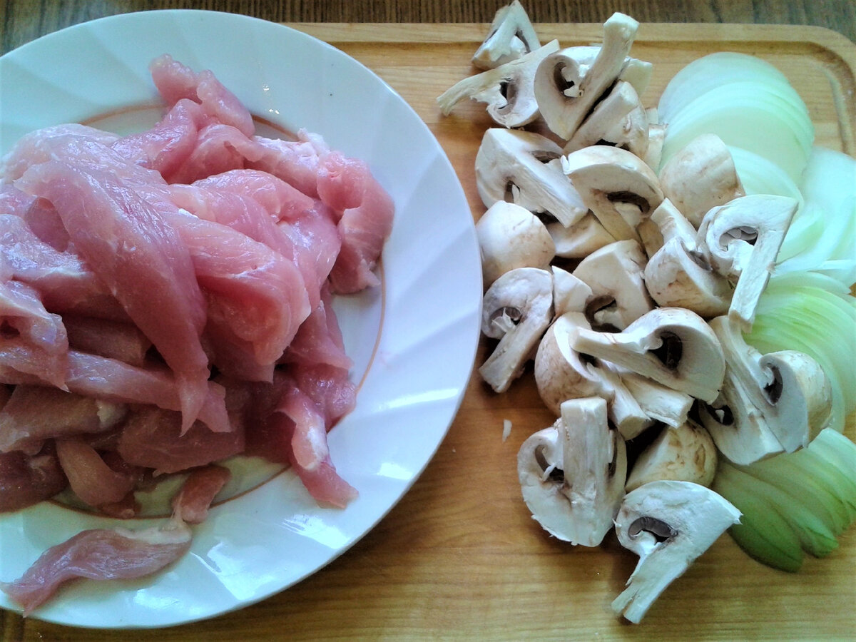 Подготовка к кулинарному приключению всегда начинается с выбора свежих продуктов. Для этого рецепта требуется свинина, которую легко нарезать полосками, а грибы — на четвертинки. Репчатый лук следует нарезать перьями, придавая блюду особый аромат.